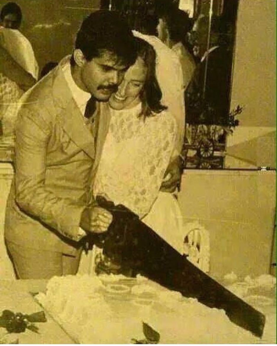 Resimde bir düğün pastası kesen bir çift görülüyor. Damat, pastayı kesmek için testere kullanıyor. Şaka, düğün pastası keserken...