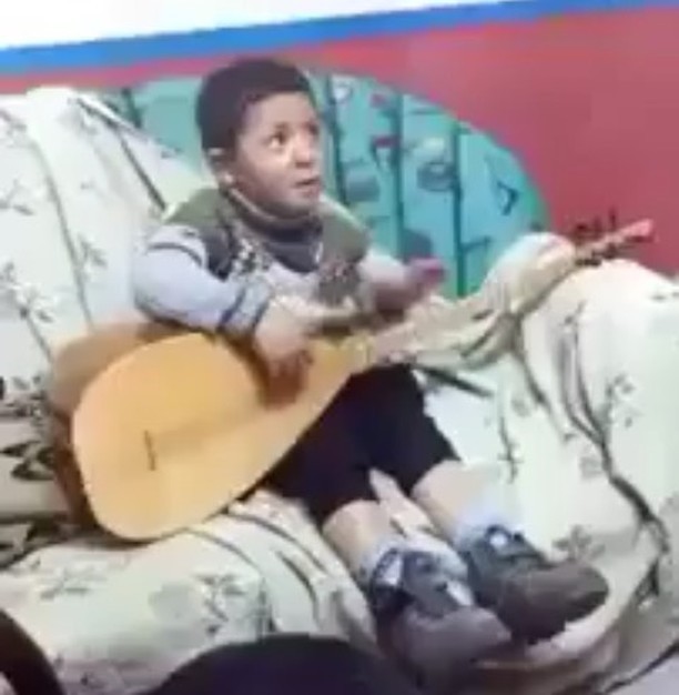 Fotoğrafta küçük bir çocuk, bağlama çalmaya çalışıyor. Fakat çok küçük olduğu için, bağlama ona göre çok büyük ve onu taşımakta...