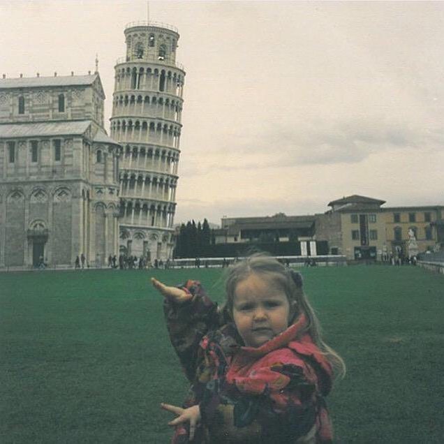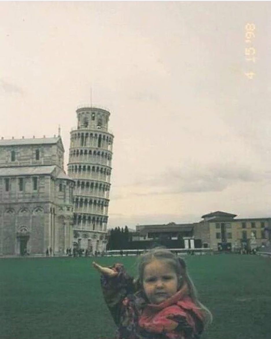Resimde, Pisa Kulesi'nin önünde duran bir çocuk görülüyor. Çocuk kuleye işaret ediyor ve bu da "Kule'yi ben eğdim!" gibi bir mesaj...
