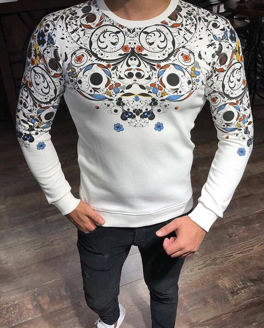Fotoğrafta beyaz üzerine çiçek desenli bir sweatshirt giymiş bir adam var. Adamın üstünde giydiği sweatshirt, Türkçede "çıkma" olarak...