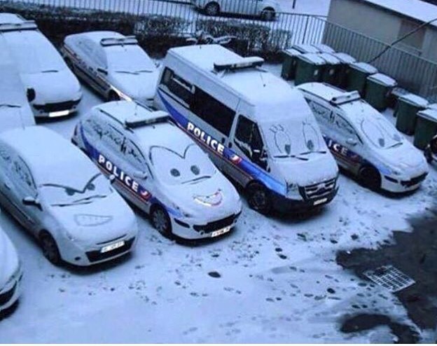 Resimde karla kaplı bir sokakta park edilmiş beş polis arabası görülüyor. Arabaların hepsi beyaz karla kaplı ve ön camlarına komik...