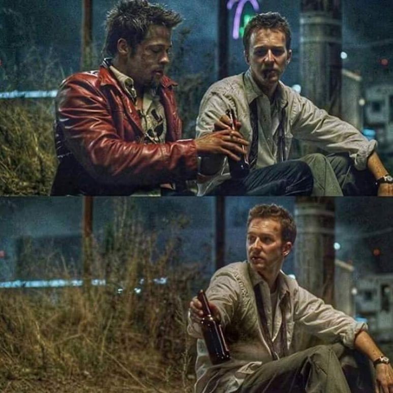 Resimde, Fight Club filminden iki karakter olan Tyler Durden (Brad Pitt) ve The Narrator (Edward Norton) görünüyor. İlk karede Tyler...