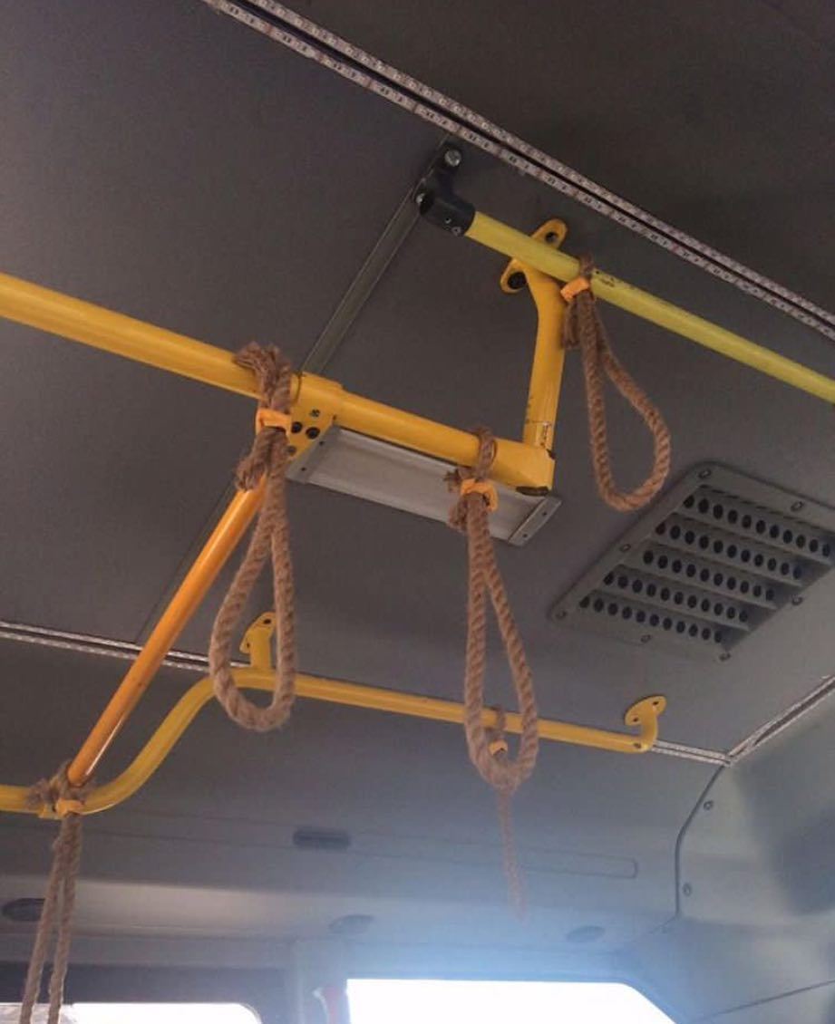 Fotoğrafta otobüste yolcuların tutunması için kullanılan sarı renkli tutamaklar ve ipler görünüyor. Ancak ipler kesilmiş ve aşağı...