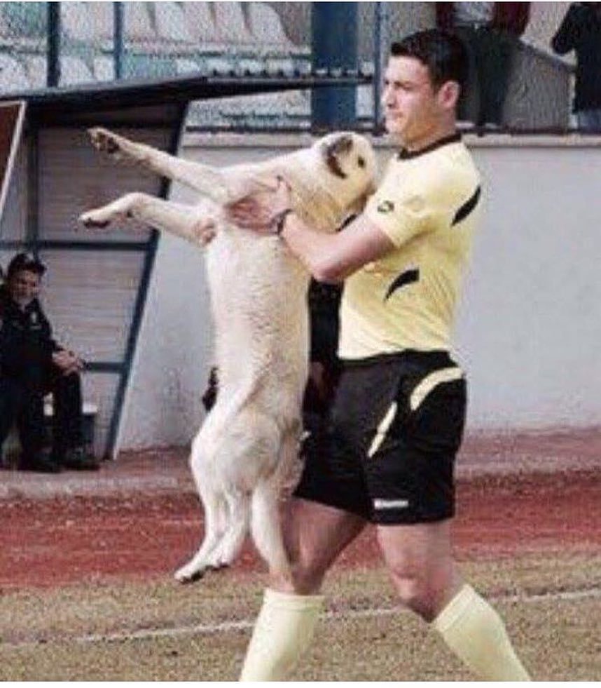 Fotoğrafta bir adam beyaz bir köpeği havaya kaldırıyor ve köpek havaya zıplıyor gibi görünüyor. Adamın mutlu bir şekilde gülümsemesi de...