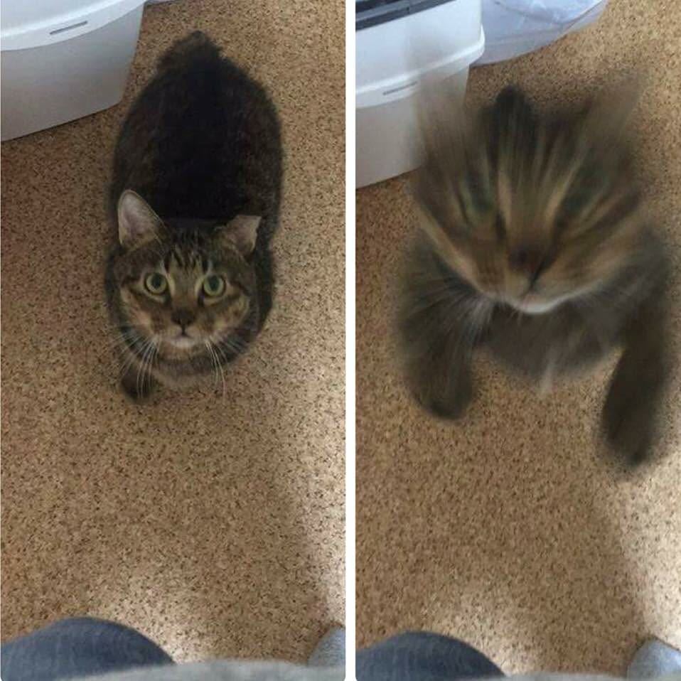Resimde bir kedi iki farklı şekilde görünüyor. Bir tarafta normal olarak otururken, diğer tarafta bulanık ve hareket halindeymiş gibi...