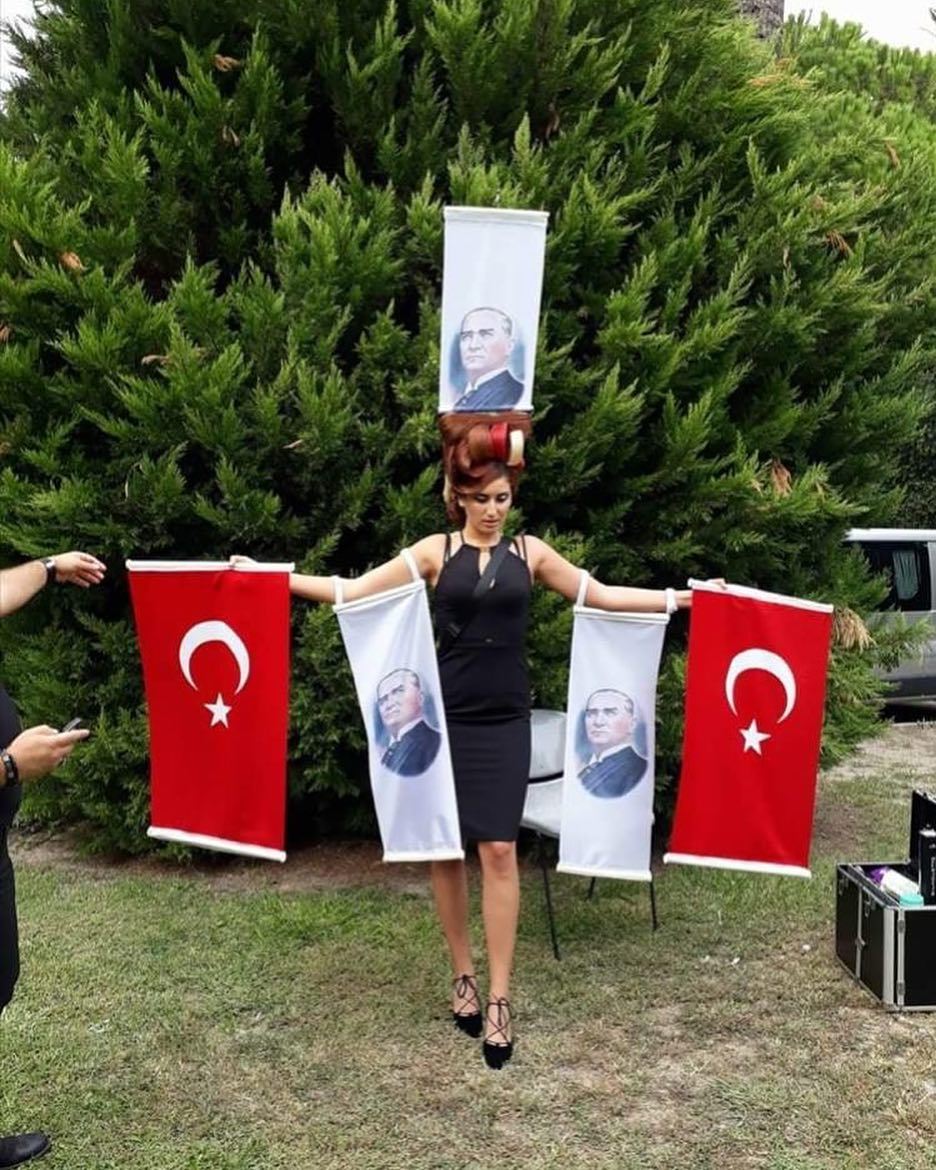Fotoğrafta, yüzü ve vücudu tamamen gümüş boya ile kaplı bir adam görüyoruz. Adamın gözlerinde güneş gözlüğü, göğsünde ise kırmızı hilal...