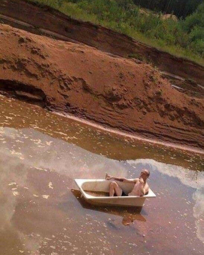 Fotoğrafta, kırmızı toprak bir kıyıya yakın, küçük bir nehirde tek başına bir adamı gösteriyor. Adam bir küvetin içinde oturmuş, suda...