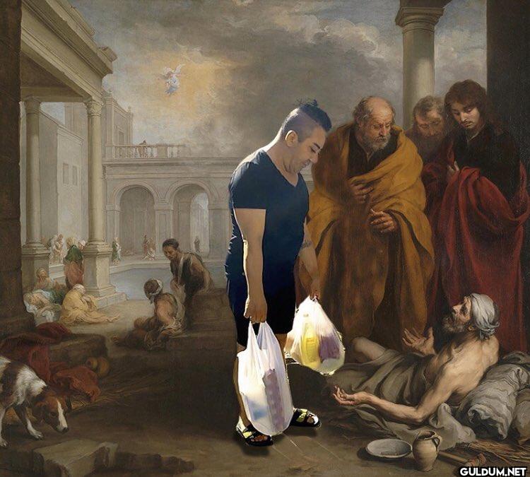 Fotoğrafta, klasik bir resim üzerine modern bir figürün eklenmesiyle oluşturulmuş bir mizah unsuru görüyoruz. Klasik resimde, muhtemelen...