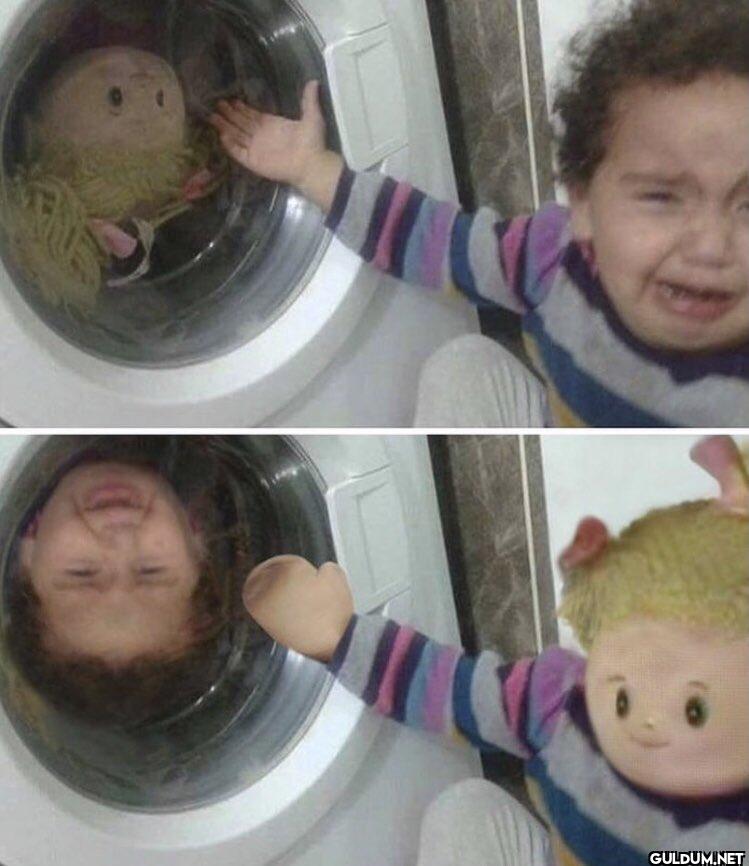 Fotoğrafta bir çamaşır makinesinde bir çocuk ve bir oyuncak bebek var. İlk karede, çocuk ağlıyor ve çamaşır makinesindeki oyuncağa...