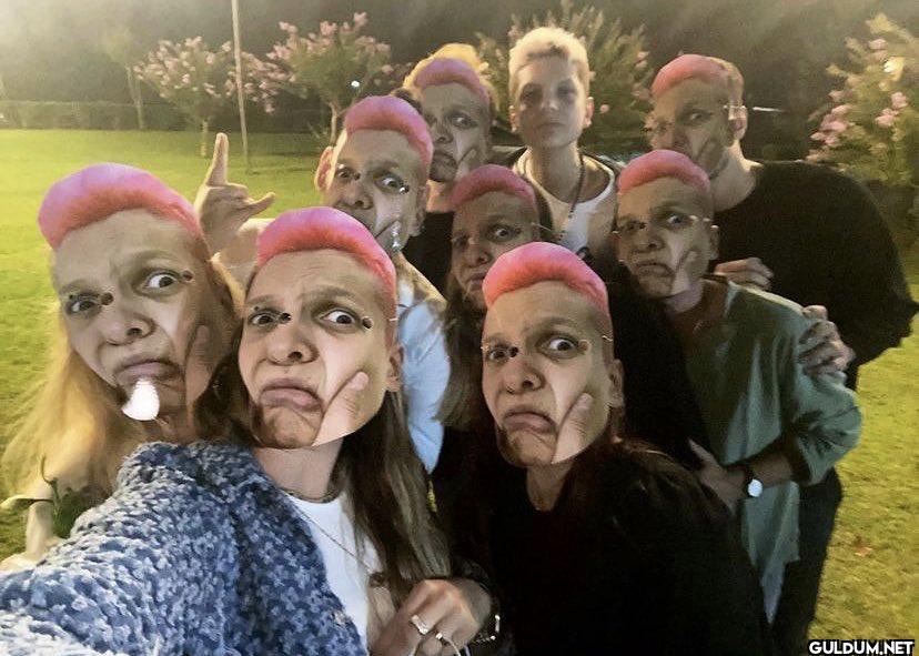 Fotoğrafta, bir grup insanın yüzlerine aynı tuhaf maskeler takıp bir araya gelerek bir selfie çektikleri görülüyor. Maskeler, pembe...