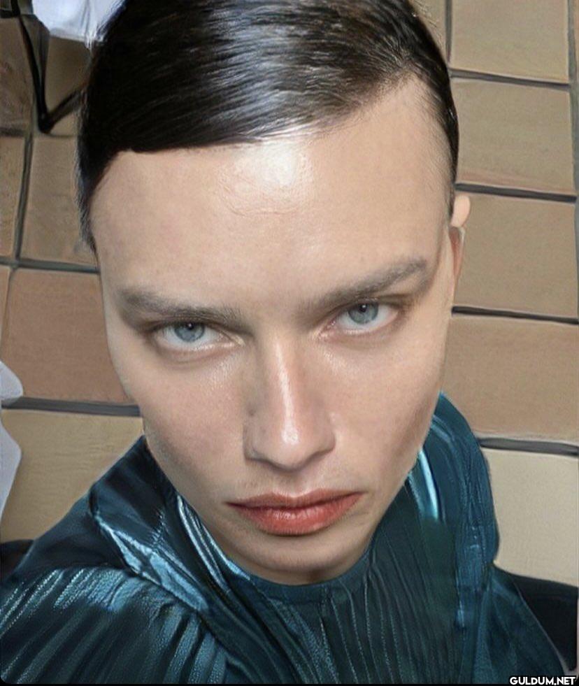 Fotoğrafta, mavi gözlü, parlak bir cilde ve belirgin yüz hatlarına sahip, genç bir adamın yakın çekim portresi görülüyor. Saçları geriye...