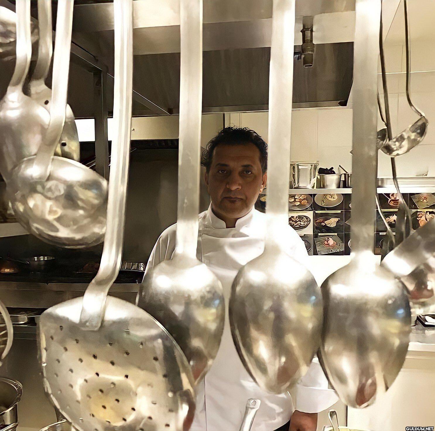 Fotoğrafta, profesyonel bir mutfakta çekilmiş bir sahne görüyoruz. Ön planda, parlak metal mutfak gereçleri, özellikle de büyük kepçeler...