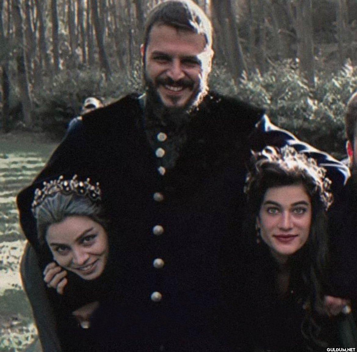 Fotoğrafta, üç kişi gülümsüyor ve poz veriyor. Ortada, siyah bir ceket giymiş, sakallı bir erkek var. İki kadın da onun kollarının...