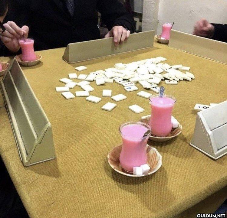 Fotoğrafta, domino taşı oyunu oynayan bir grup insan ve onlara eşlik eden pembe renkli içecekler görünüyor. İçeceklerin yanı sıra küp...