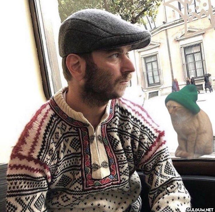 Fotoğrafta şunlar var: * Şapka takmış, sakallı bir adam, pencere kenarında oturuyor. Üzerinde geleneksel desenli bir kazak var. * ...