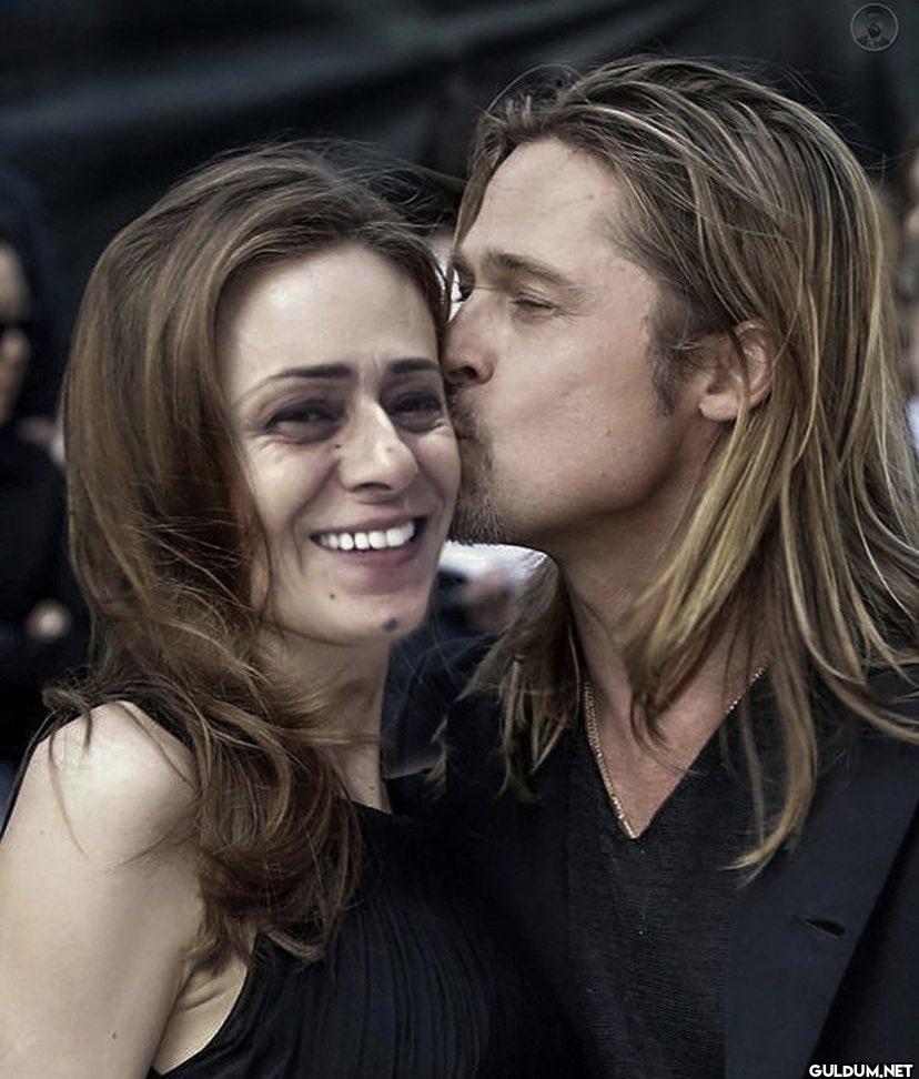 Fotoğrafta, Brad Pitt'e benzeyen uzun saçlı bir adamın, yüzünden öptüğü, gülümseyen bir kadın görülüyor. Bu durum, muhtemelen sosyal...