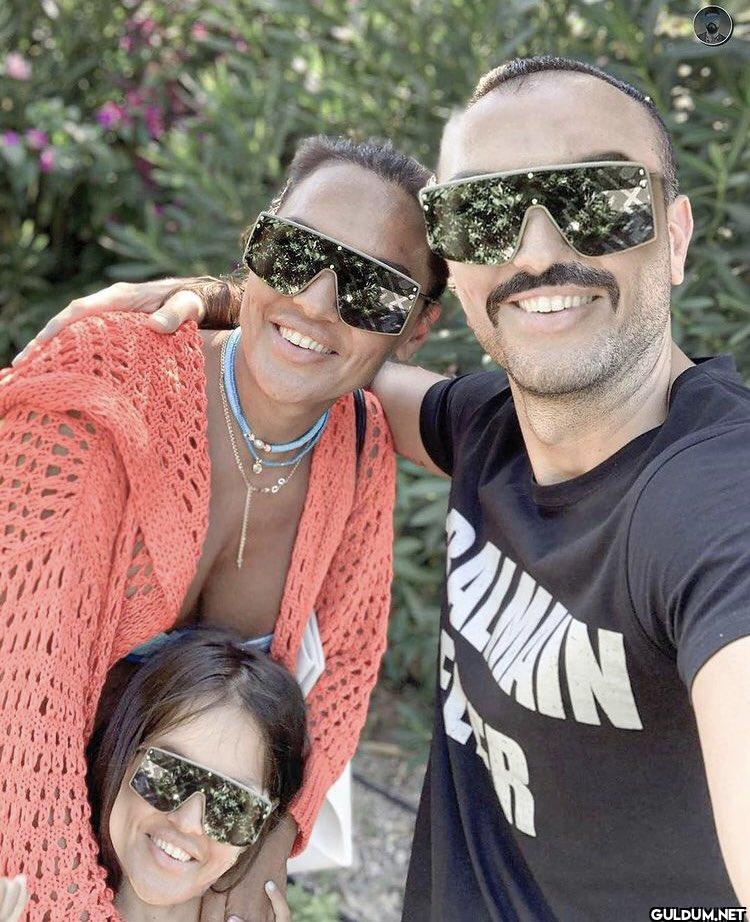 Fotoğrafta üç kişi var: biri erkek, ikisi kadın. Hepsi güneş gözlüğü takmış ve gülümsüyorlar. Ortadaki kadın turuncu bir hırka giymiş ve...