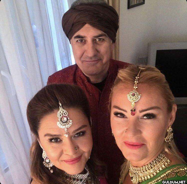 Fotoğrafta, Hint kıyafetleri giymiş üç kişi bulunuyor. Ortada, bir türban takmış ve Hint tarzı bir elbise giymiş bir erkek var. İki...