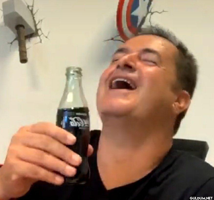 Fotoğrafta, gülen bir adamın elinde bir Coca-Cola şişesi var. Arka planda Thor'un çekici ve Kaptan Amerika'nın kalkanı gibi Marvel...