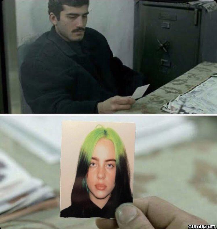 Fotoğrafta, üst kısımda, elinde bir kağıt tutan, bıyıklı bir adam görülüyor. Alt kısımda ise, elinde bir fotoğraf tutan bir el var....