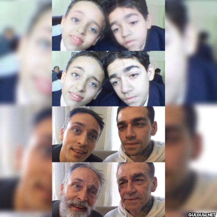 Fotoğrafta, iki kişinin farklı yaşlardaki hallerinin sıralı bir kolajı yer alıyor. İlk iki karede okul üniformalı iki çocuk, daha sonra...
