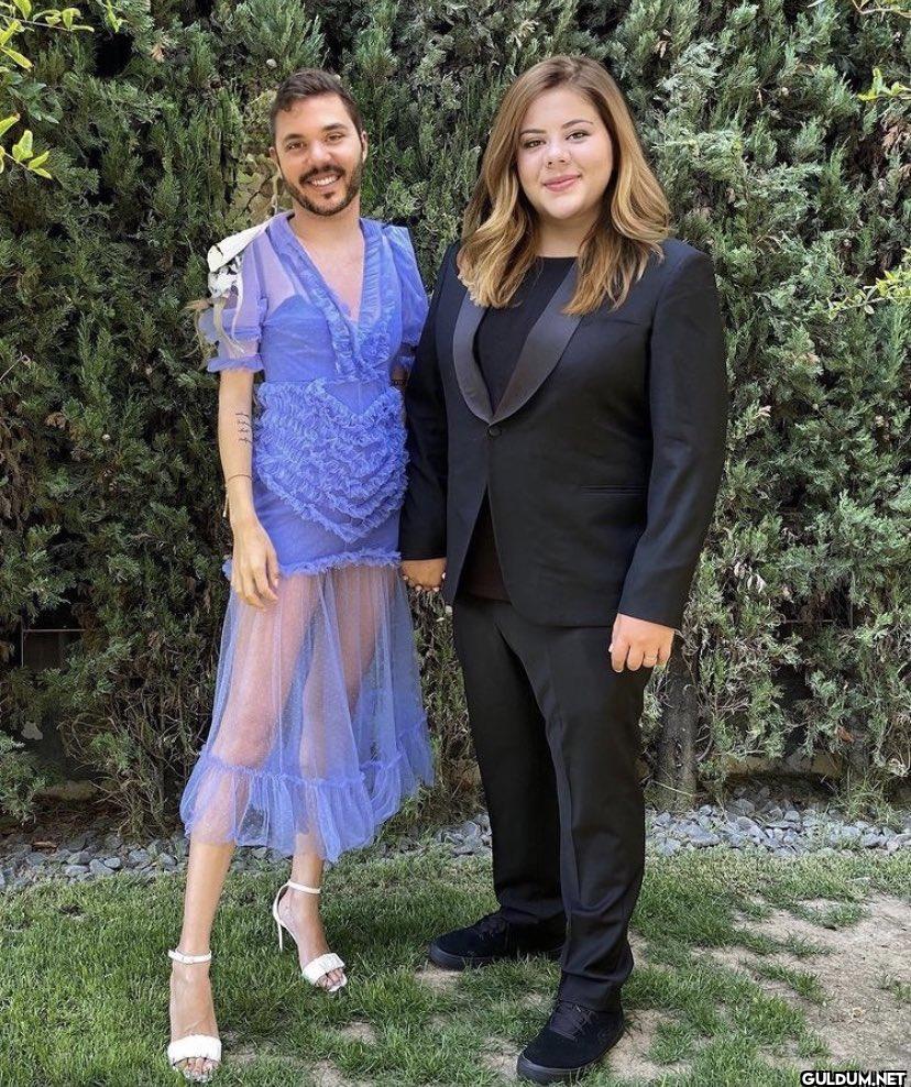 Fotoğrafta iki kişi bulunuyor. Soldaki kişi, mavi renkli, şeffaf bir etek kısmı olan, fırfırlı bir elbise giymiş, beyaz topuklu...