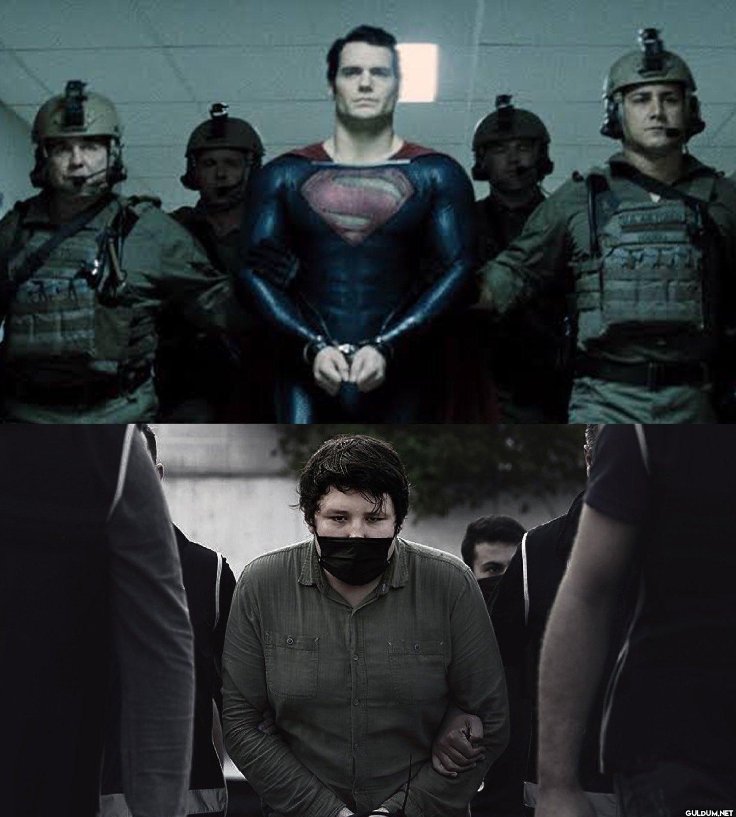 Fotoğrafta, üst kısımda Superman filminden bir sahne görülüyor. Superman, askerler tarafından tutuklanmış ve kelepçelenmiş bir şekilde...