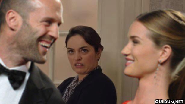 Fotoğrafta, ortada yüzü buruşmuş, kıskanç bir kadın, sağda gülümsediği görülen bir kadın ve solda takım elbiseli gülen bir erkek var....