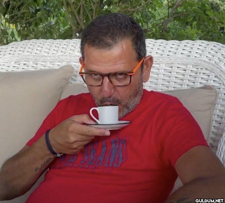 Fotoğrafta, gözlüklü, sakallı ve kırmızı bir tişört giymiş, kahve içerken görülen bir adam var. Elinde küçük bir kahve fincanı ve tabağı...