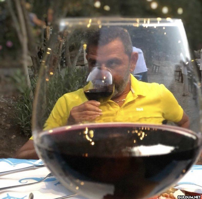 Fotoğrafta, sarı bir tişört giymiş, sakallı bir adamın kırmızı şarabını koklarkenki görüntüsü, büyük bir şarap kadehinin içinden...