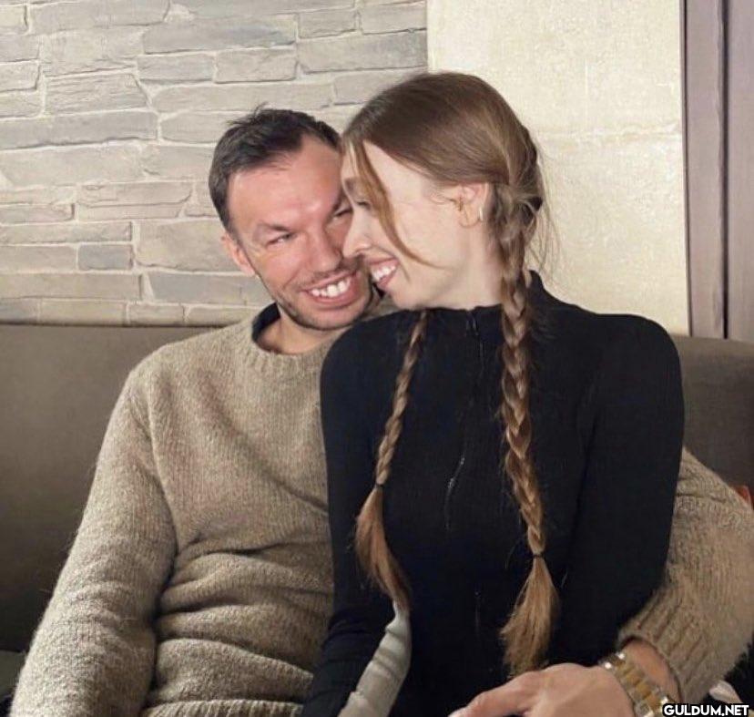 Fotoğrafta, birbirine sarılmış, birbirlerine bakan ve gülen iki genç insan var. Kadın, iki örgülü saçlı, siyah bir bluz giymiş. Adam ise...