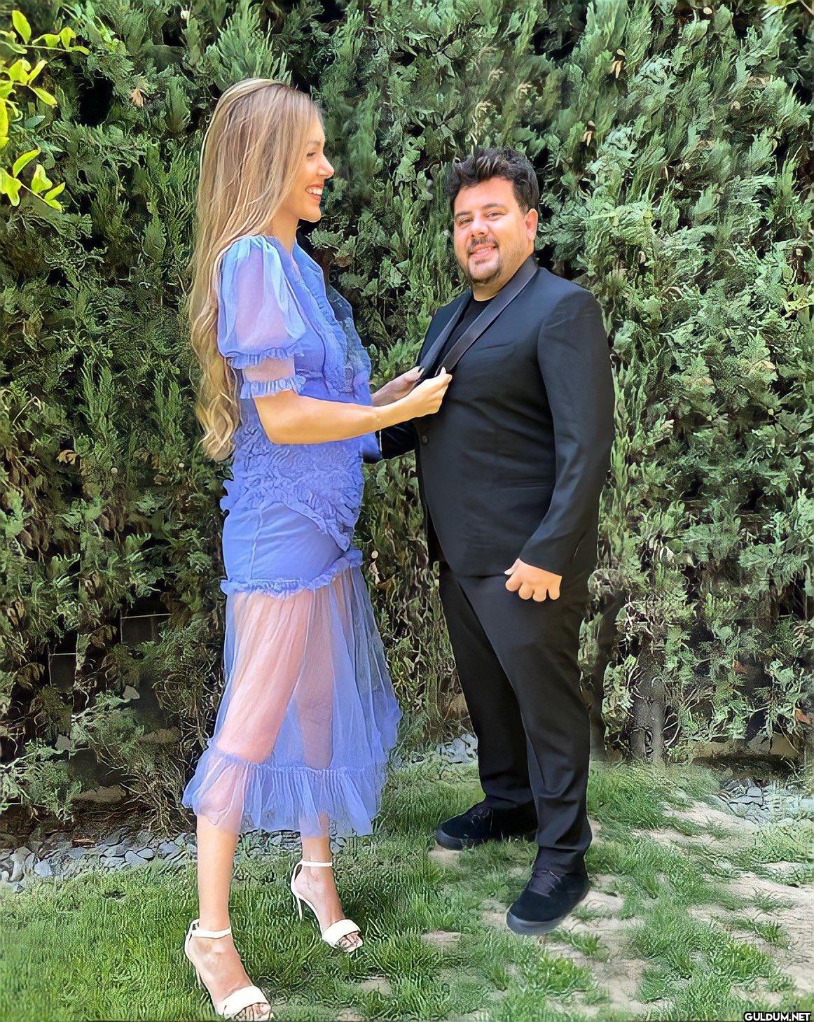 Fotoğrafta, mavi bir elbise giymiş uzun boylu bir kadın, siyah bir takım elbise giymiş, daha kısa boylu bir erkeğin yakasını düzeltiyor...