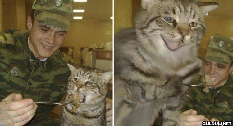 Fotoğrafta, askeri üniforma giymiş iki kişi ve bir kedi bulunuyor. Solda, bir asker kediyi bir çatal yardımıyla beslerken görülüyor....