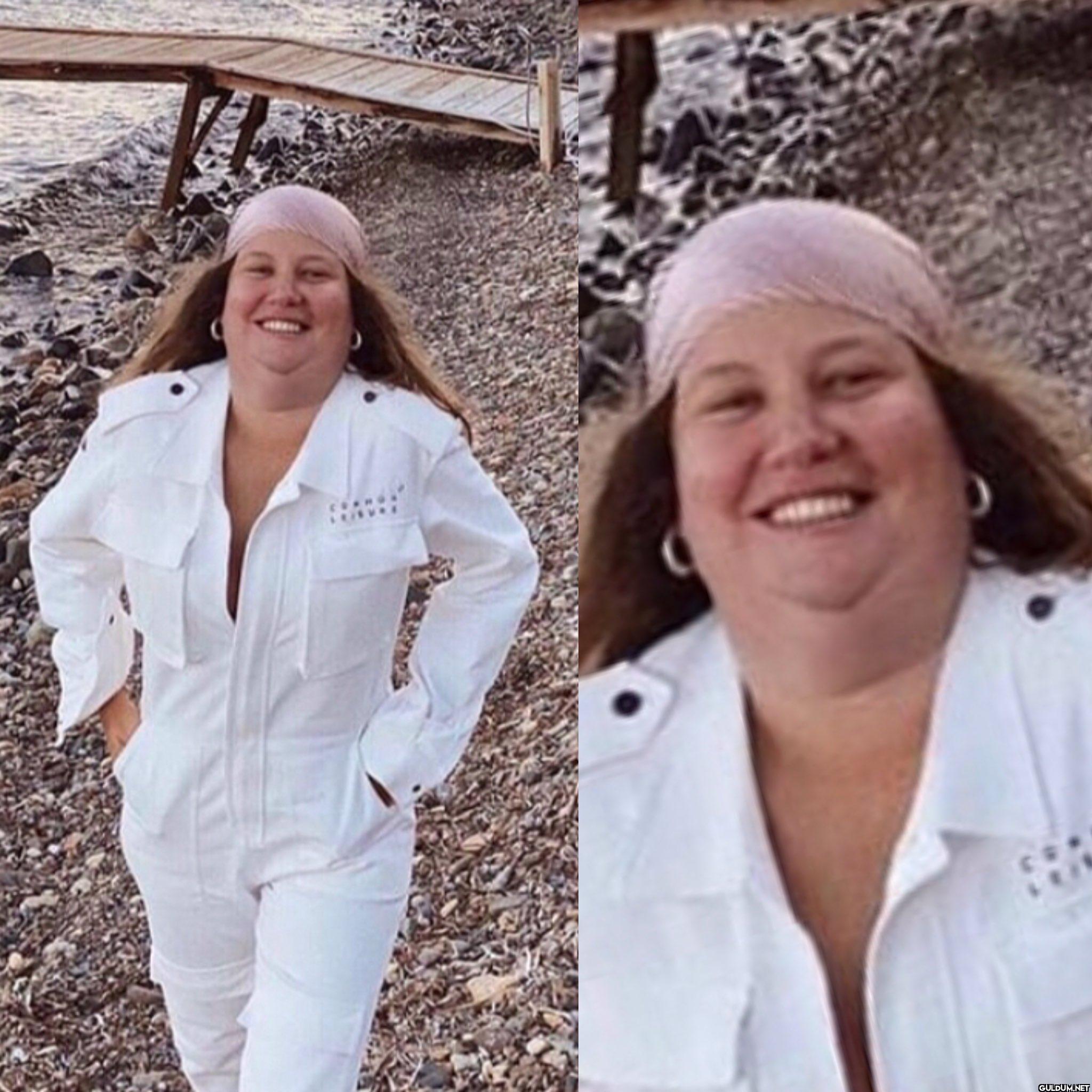 Fotoğrafta, beyaz bir tulum giymiş, başörtüsü takmış ve gülümsüyen bir kadın görülüyor. Arka planda bir deniz kenarı ve bir iskele...