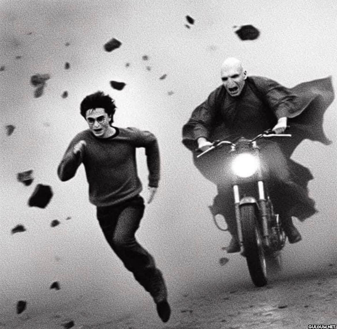 Fotoğrafta Harry Potter koşarken, Lord Voldemort'un bir motosikletle onu kovaladığı siyah beyaz bir sahne canlandırılıyor. Voldemort'un...