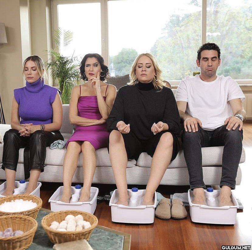 Fotoğrafta, bir kanepede oturan dört kişi görülüyor. Hepsi ayaklarını beyaz plastik kaplara koymuşlar ve görünüşe göre ayak banyosu...