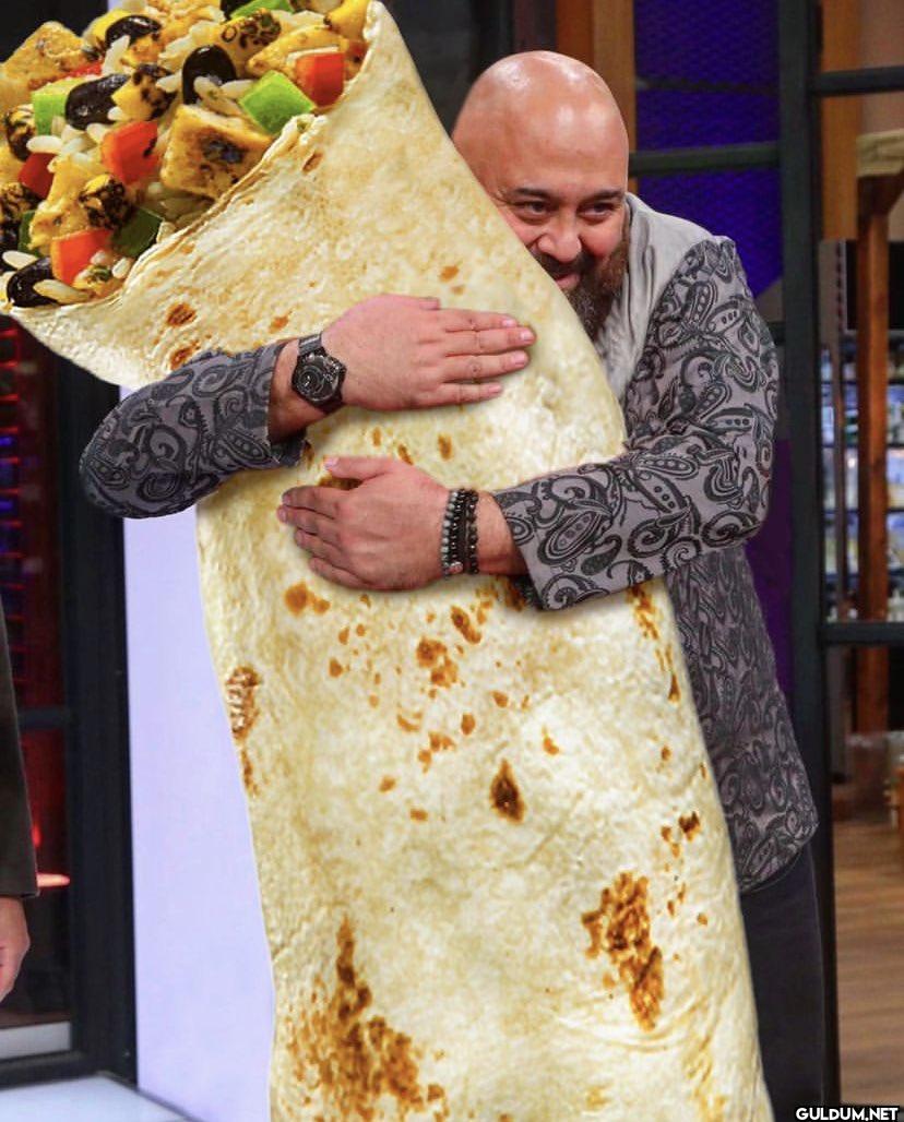Fotoğrafta, büyük bir dürümü kucaklayan, gülümseyen, sakallı bir adam görüyoruz. Adamın üzerindeki kıyafetler ve saçı, onu bir...