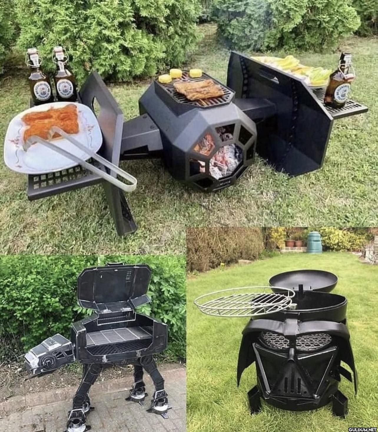 Fotoğrafta, Star Wars temalı, farklı tasarımlarda imal edilmiş üç ayrı dış mekan mangal bulunmaktadır. İlk mangal, bir Star Wars X-wing...