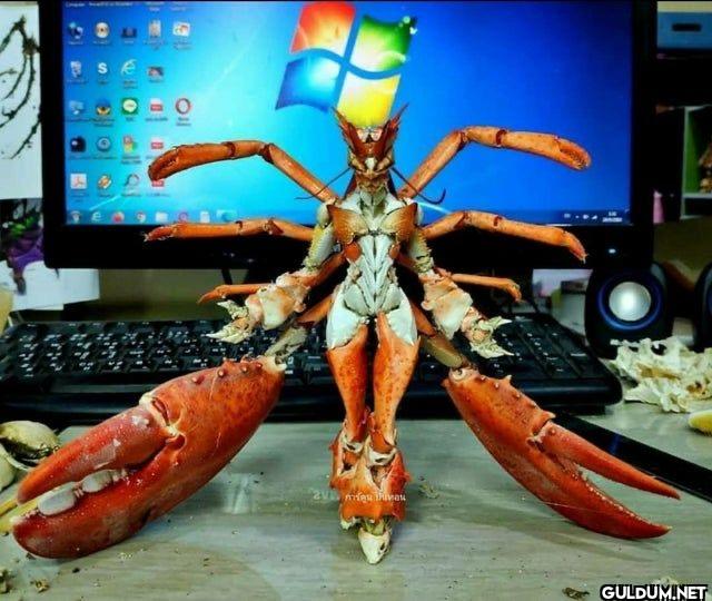 Resimde, Windows işletim sisteminin üzerinde, kabukluların (özellikle ıstakozların) vücut yapılarından esinlenilmiş, bir tür anime veya...