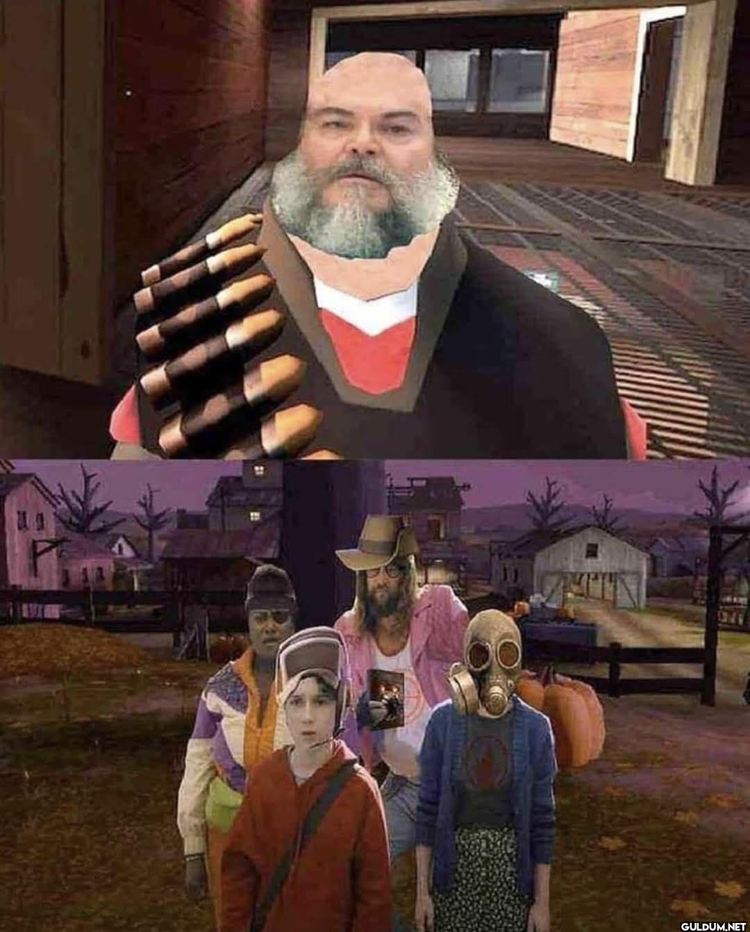 Fotoğrafta, iki farklı sahne birleştirilmiş. Üst kısımda, Team Fortress 2 oyunundan "Heavy" karakterinin yüzü, gerçek bir kişinin...