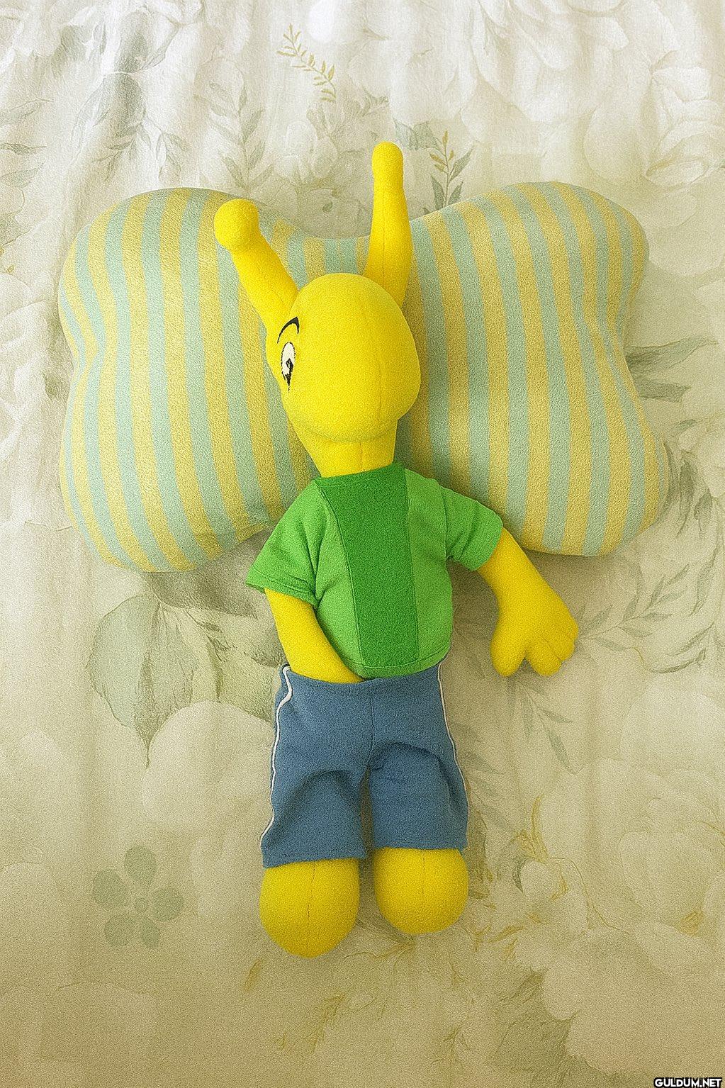 Fotoğrafta, sarı renkli bir oyuncak karakter ve üzerinde sarı ve yeşil çizgili bir yastık var. Oyuncak, yeşil bir tişört, mavi bir şort...