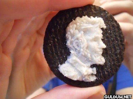 Fotoğrafta bir Oreo bisküvi görünüyor. Ancak bisküvinin üzerine beyaz krema ile oyulmuş bir portre yapılmış. Görünen portre muhtemelen...