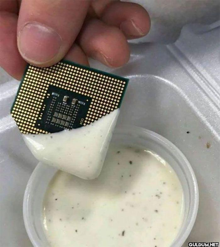 Fotoğrafta bir işlemci (CPU) yongası, üzerine bir çeşit sos (muhtemelen mayonez veya benzeri bir sos) dökülmüş olarak görünüyor. ...
