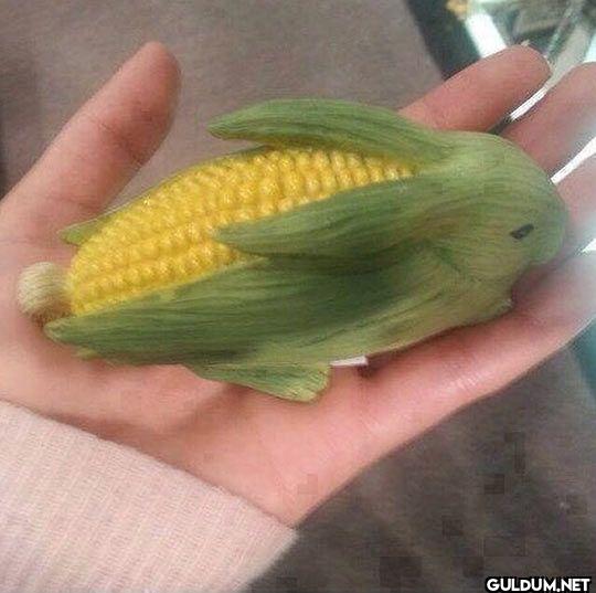 Fotoğrafta, bir elin içinde, mısır koçanı kullanılarak şekillendirilmiş bir tavşan figürü görülüyor. Mısır koçanının yeşil yaprakları...