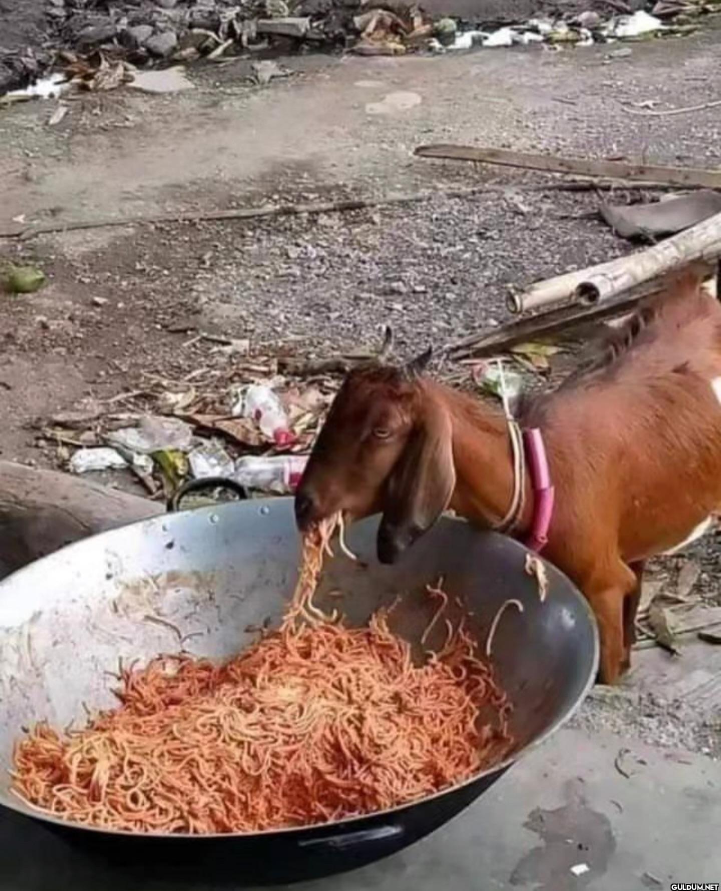 Fotoğrafta, çöplerle dolu bir alanda, bir keçi, büyük bir tenceredeki çok miktarda makarna yiyor. Şaka, keçiye makarnanın verilmesi ve...