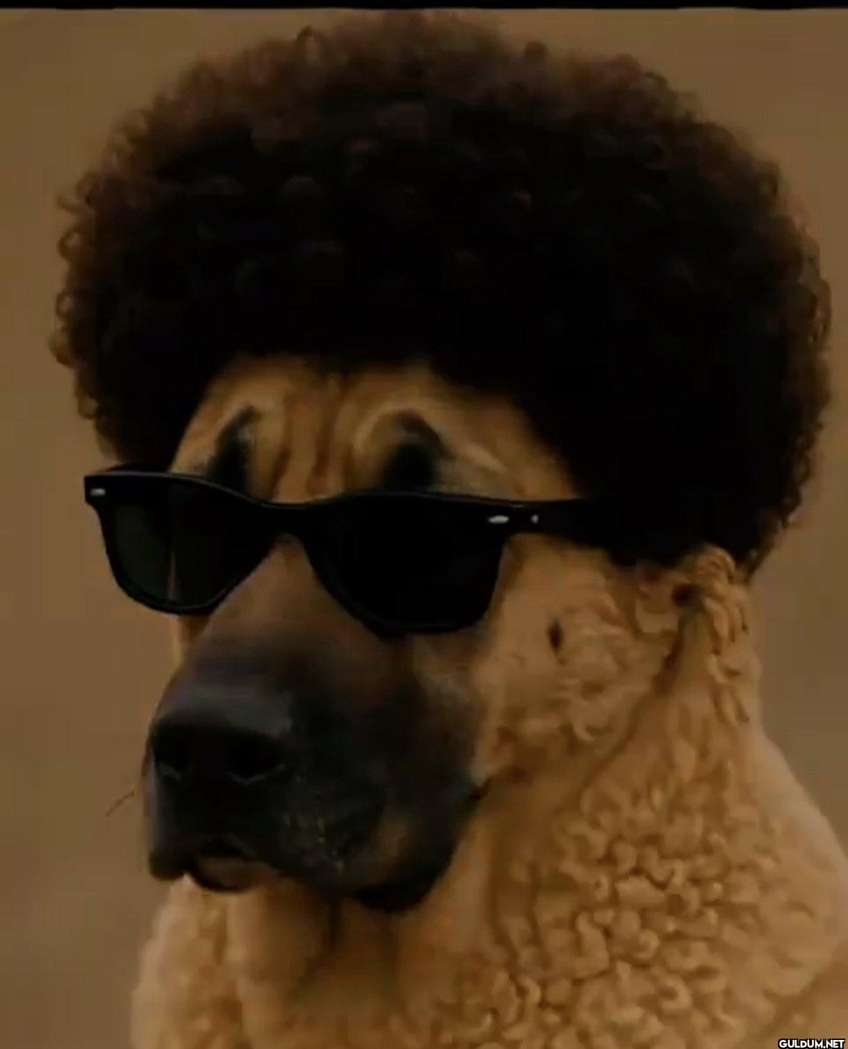 Fotoğrafta, üzerinde afro saç ve güneş gözlüğü olan bir köpek var. Bu köpek, "cool" bir hava yaratmak için tasarlanmış gibi görünüyor....