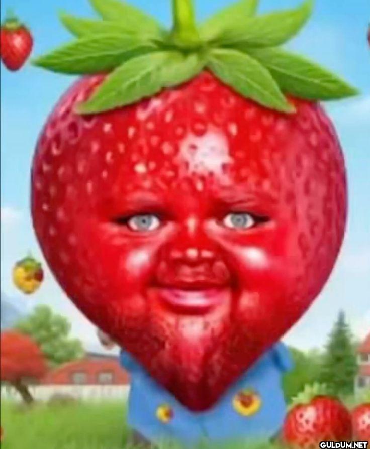 Fotoğrafta, bir çilek kılığına girmiş bir yüz görüyoruz. Çileğin üzerinde, insan yüzüne benzer bir surat tasviri yapılmış. Mavi bir...